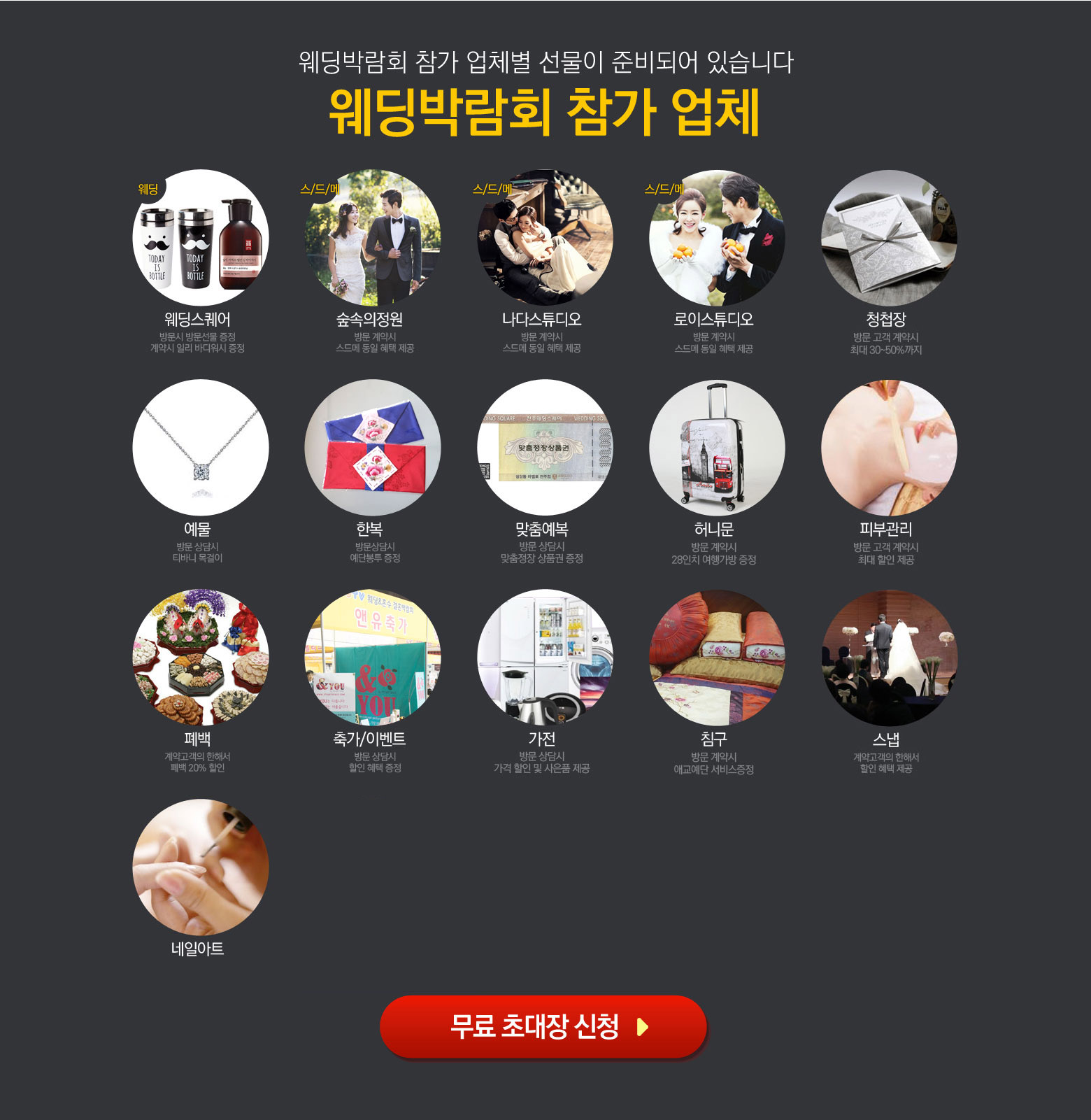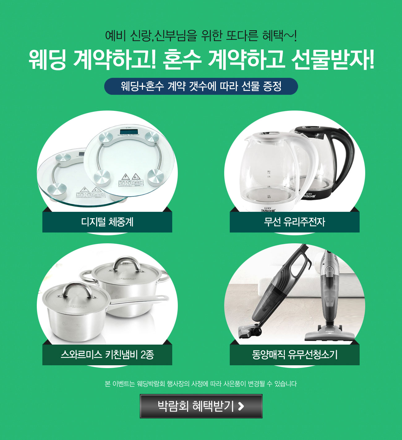 회사는 회원에 대하여 보다 더 질 높은 서비스 제공 등을 위해 아래와 같이 귀하의 개인정보를 제공하고 있습니다. *개인정보의 수집·이용 목적 -웨딩관련 서비스 상담 및 이용 권유 -회원관리 및 서비스 이용 의사 확인 -각종 서비스 및 이벤트 안내 * 수집하는 개인정보의 항목 - 이름, 휴대폰번호, 결혼예정일, 이메일, 기타문의사항 등 * 개인정보의 보유 및 이용기간 - 개인정보 삭제 및 탈회를 요청할 때까지 보유·이용합니다. - 웨딩컨설팅 계약자인 경우 개인정보에 관한 회사 내부 방침에 따라 개인정보를 보유합니다. - 불량회원 관리 및 소비자보호에 대한 법률 등 타 법률에 의해 보존해야 할 필요가 있는 경우에는 일정기간 보존합니다 * 다만, 아래의 경우에는 예외로 합니다. - 이용자들이 사전에 동의한 경우 - 법령의 규정에 의거하거나, 수사 목적으로 법령에 정해진 절차와 방법에 따라 수사기관의 요구가 있는 경우